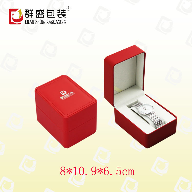 編號:QS-JS028Z 規(guī)格:8*10.9*6.5MM 起訂量:1000PCS LOGO:盒面壓印LOGO 顏色:紅色 樣期:七天 貨期:確認(rèn)大貨樣20個工作日 描述:PU皮包膠胚,內(nèi)飾絨布,配C支手表架